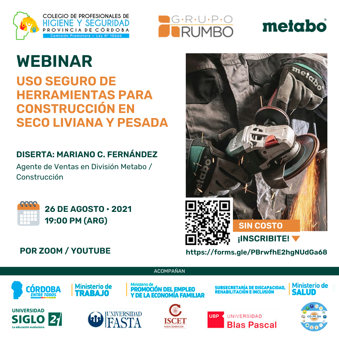 Webinar: Uso seguro de herramientas para construcción en seco liviana y pesada Jueves 26 de Agosto a las 19 p. m. (ARG)